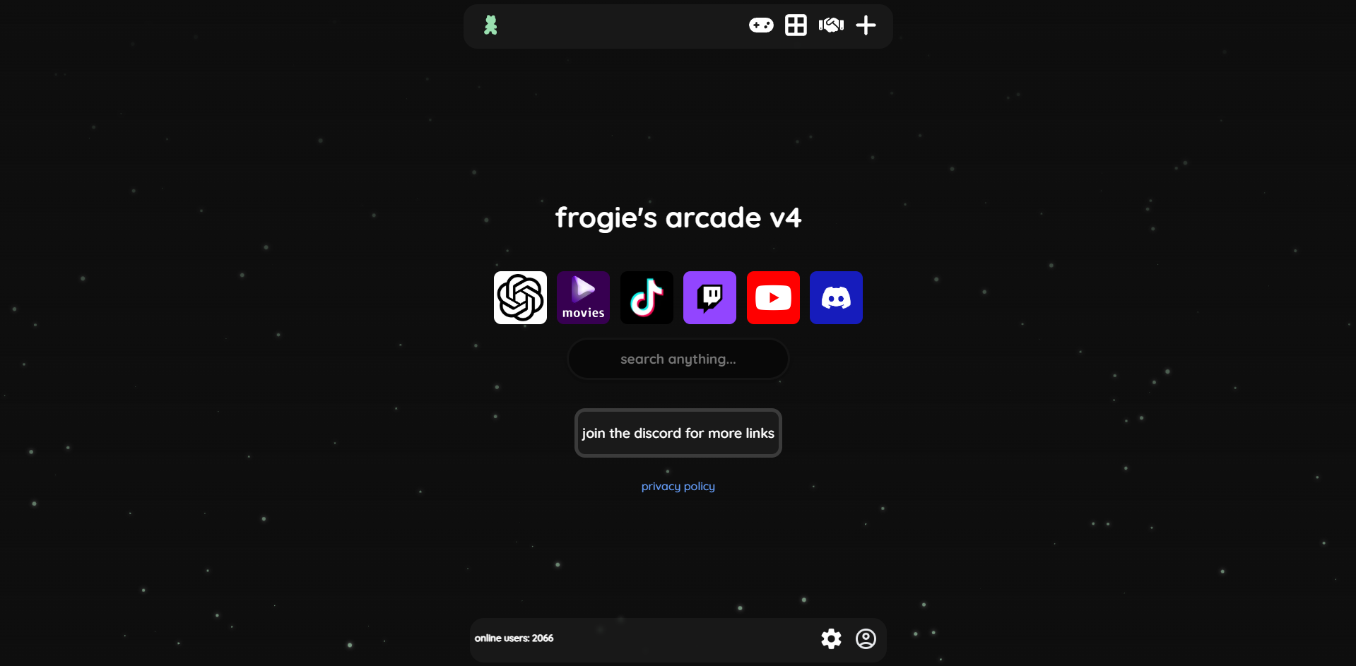 frogie's arcade is a hybrid games/proxy site designed to allow normally restricted content to be unblocked at school. it houses multiple popular apps, 150+ games that include popular games such as roblox, cuphead, hollow knight, and more. the brand is the main one out of the 3 other services i own, and the 2 other services are under the frogie's arcade brand. frogie's arcade was at one point the largest unblocked game site on the planet, having 14,000+ concurrent users online at once!
