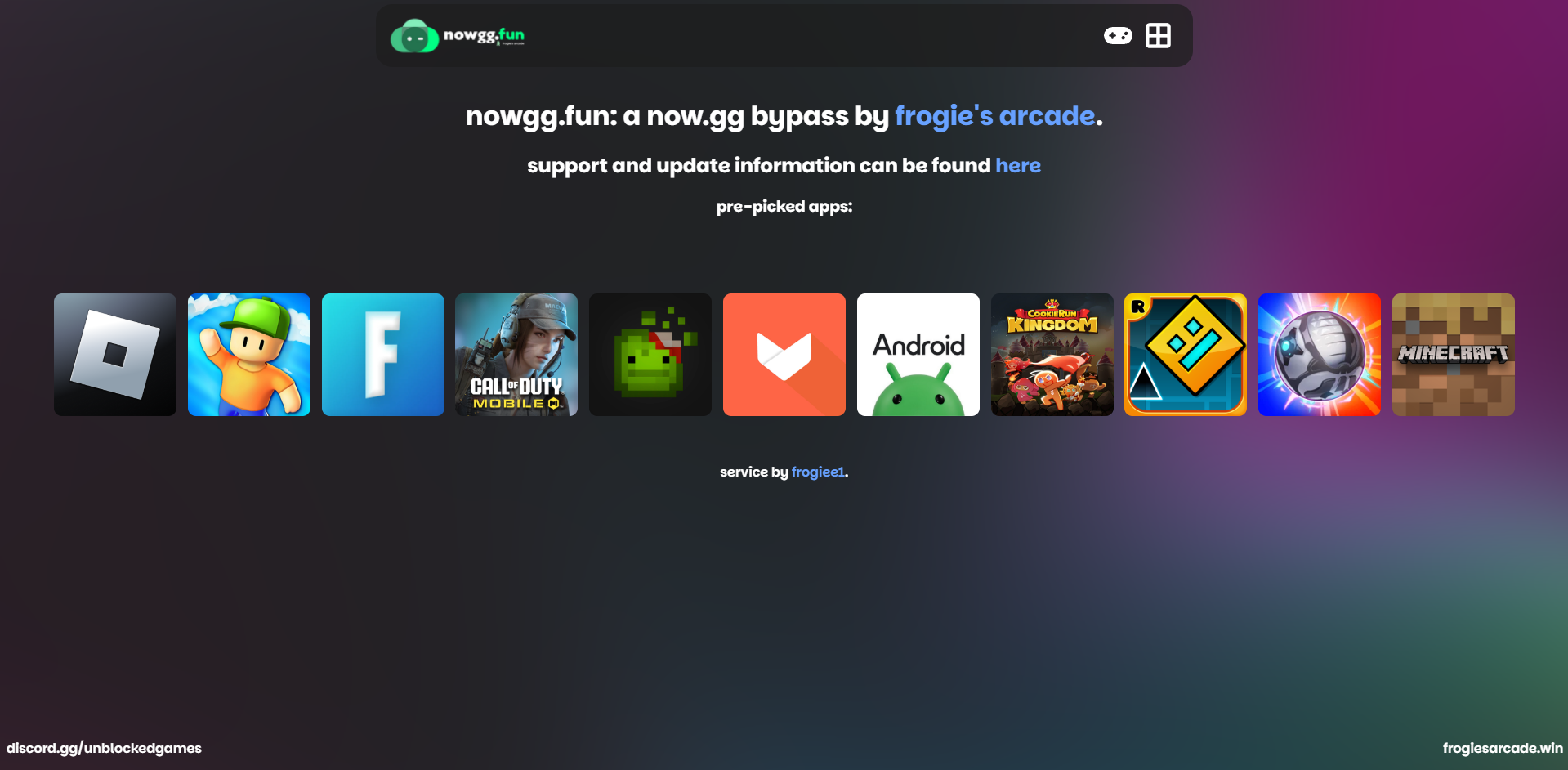 nowgg.fun is the one of a kind now.gg bypass, and is the ONLY one that works. nowgg.fun allows you to play android games in the cloud like roblox via now.gg, which usually blocks proxies. on top of that, nowgg.fun blocks all now.gg ads, allows actual fullscreen you wouldn't get on actual now.gg, and more.